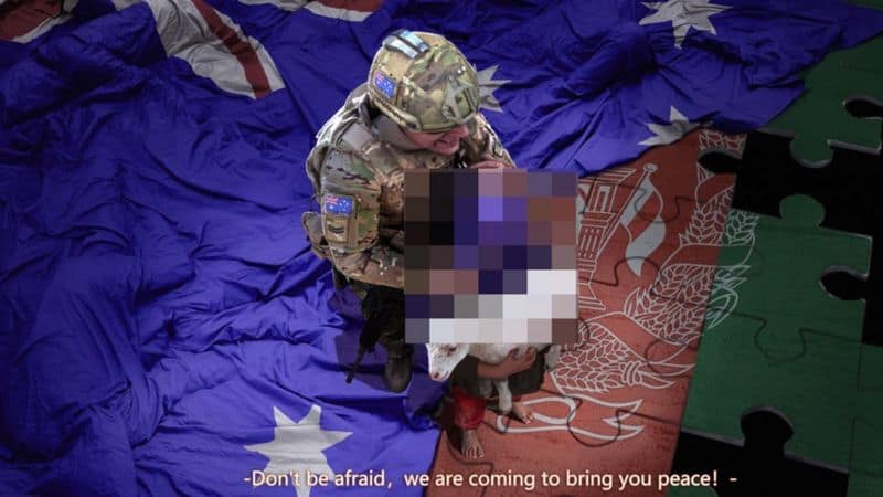 ونشر يوم الاثنين المتحدث باسم وزارة الخارجية الصينية، ليجيان تشاو، صورة مزيفة صورت جنديا أستراليا يحمل سكينا يقطر دما بالقرب من طفل يظهر وهو يحمل حملا.