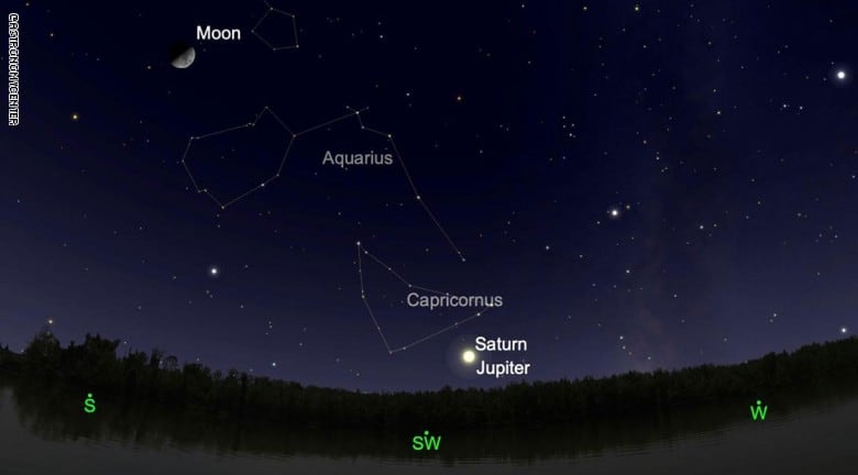 وسيتقارب المشتري وزحل مساء الاثنين فوق الأفق بعد غروب الشمس بفترة وجيزة عند الساعة 22:37 بتوقيت أبوظبي أو 21:37 بتوقيت مكة، 20:37 بتوقيت القاهرة، 18:22 بتوقيت غرينيتش، إلى مسافة تعد الأقرب منذ ما يقرب من 400 عام.