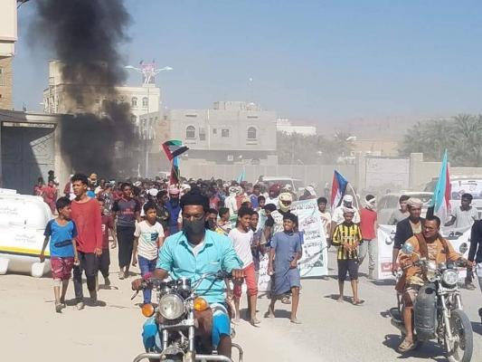 وتشهد مدن محافظة حضرموت منذ أسابيع احتجاجات مستمرة، بعد تدهور الخدمات المعيشية، وارتفاع أسعار المشتقات النفطية.