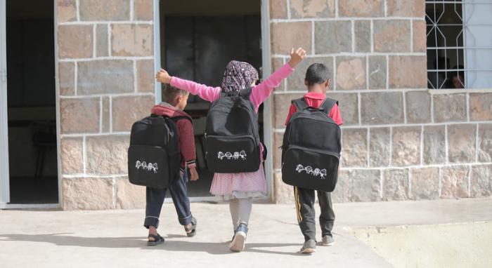 - الصورة: أطفال صغار يسيرون في تعز المتضررة بسبب الصراع في اليمن وقد حصلوا على حقائب مدرسية جديدة (اليونيسيف)