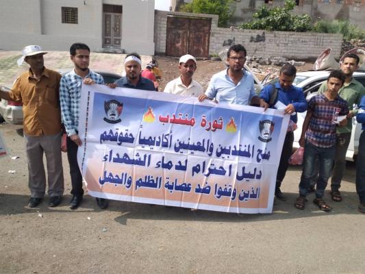 - الصورة الرئيسية: وقفة احتجاجية للمعينين أكاديمياً بدون تعزيز مالي بجامعة عدن أمام القصر الحكومي بمعاشيق، ديسمبر 2019 (الجنوب الجديد)