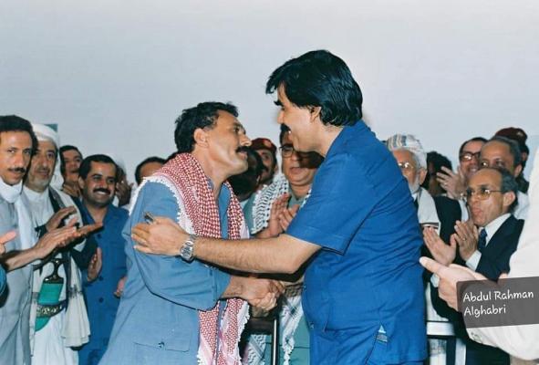 - الصورة الرئيسية: علي سالم البيض وعلي عبد الله صالح، بعد اتفاق الوحدة وتشكيل مجلس رئاسي في 1990 (عبد الرحمن الجبري)
