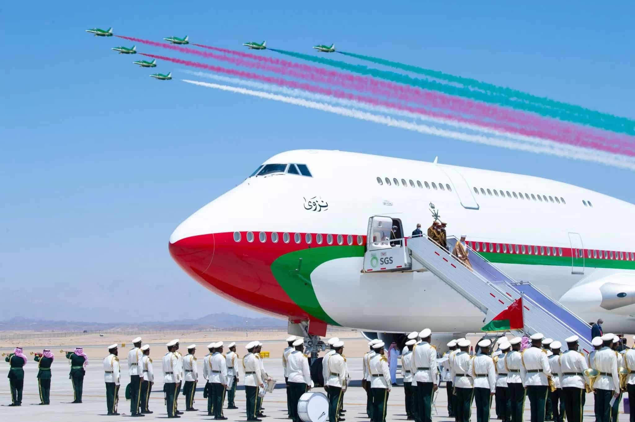 - الصورة: طائرة السلطان هيثم خلال وصولها مدينة نيوم السعودية وتظهر الطائرات الحربية التي كانت ترافقها في السماء بألوان علم عمان (إعلام سعودي رسمي)