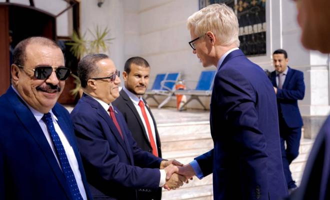 - الصورة: قيادات في المجلس الانتقالي تستقبل هانز غروندبرغ في مقر المجلس بعدن، 5 أكتوبر 2021 (المجلس الانتقالي)