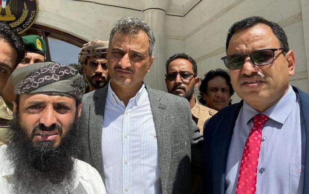 الصورة: محافظ عدن بجانب وزير الزراعة وسالم السقطري وقائد قوات الأحزمة الأمنية محسن الوالي، عقب الهجوم، الأحد، 10 اكتوبر 2021 (رسمي)