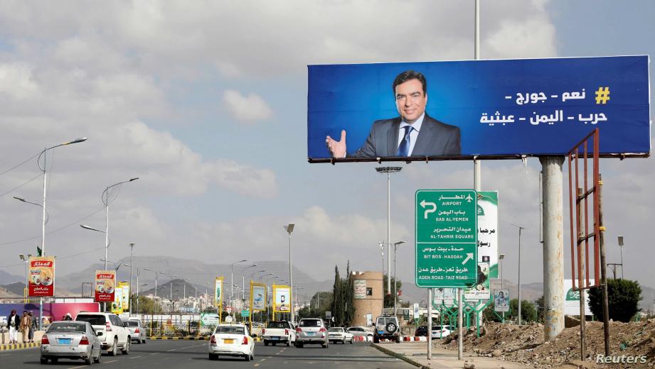 - الصورة: جماعة الحوثي رفعت لافتة عملاقة عليها صورة جورج قرداحي في أحد شوارع العاصمة صنعاء، شمال اليمن (رويترز)