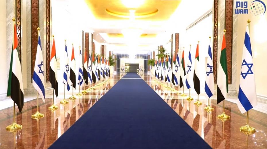 - الصورة: مقتطعة من فيديو لوكالة أنباء الإمارات، لمراسم استقبال رئيس الوزراء الاسرائيلي الذي وصل أبوظبي، مساء الأحد
