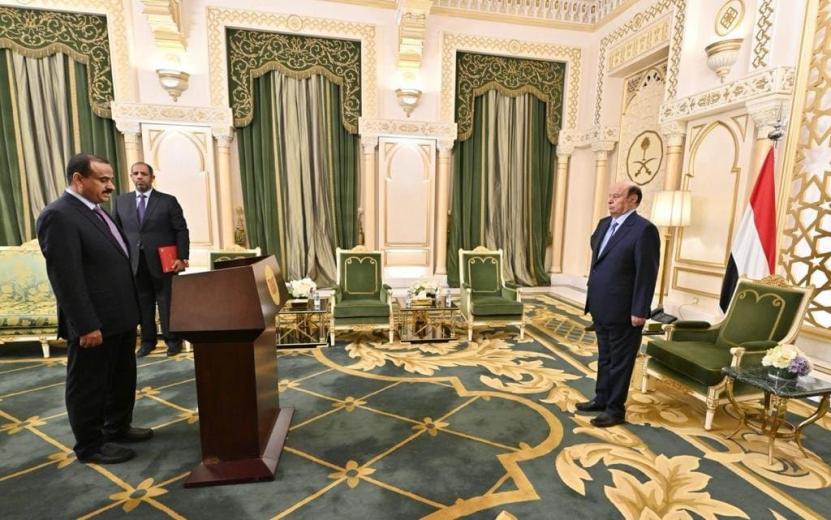 - الصورة: محافظ شبوة الجديد، عوض العولقي، يؤدي اليمين الدستوري أمام الرئيس اليمني هادي (رسمي)