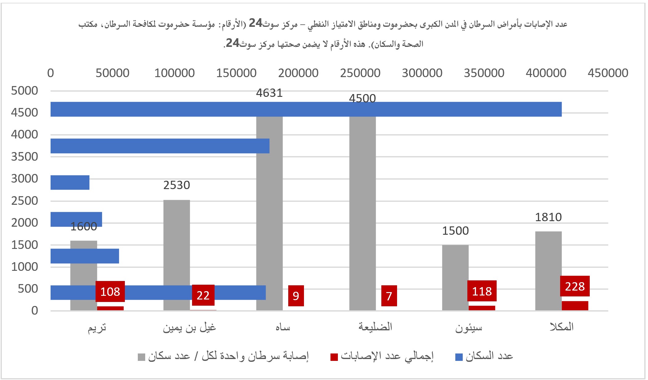 على الرغم من شحة المصادر حول أعداد الإصابات بأمراض السرطان، في مناطق الامتياز النفطي بحضرموت، تحصل «سوث24» على إحصائية حديثة لأعداد السكان في بعض مديريات المحافظة، وأخرى بأعداد المصابين، وتظهر النتائج عدم التوازن بين الكثافة السكانية والمصابين في مناطق الامتياز.