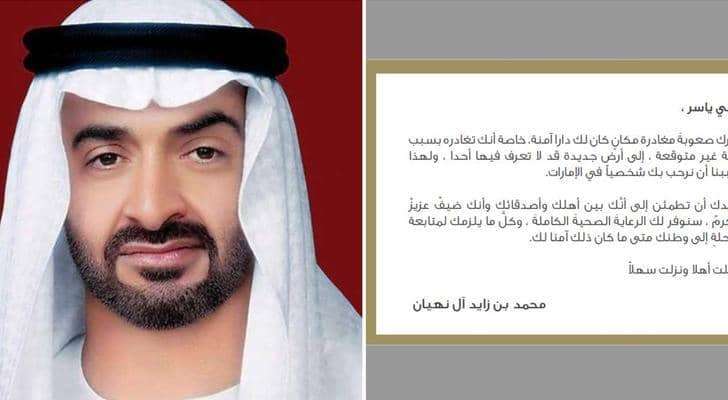 وجاء في إحدى الرسائل: "ابني ياسر، ندرك صعوبة مغادرة مكان كان لك دارا آمنة، خاصة أنك تغادره بسبب أزمة غير متوقعة، إلى أرض جديدة قد لا تعرف فيها أحدا، ولهذا أحببنا أن نرحب بك شخصيا في الإمارات".