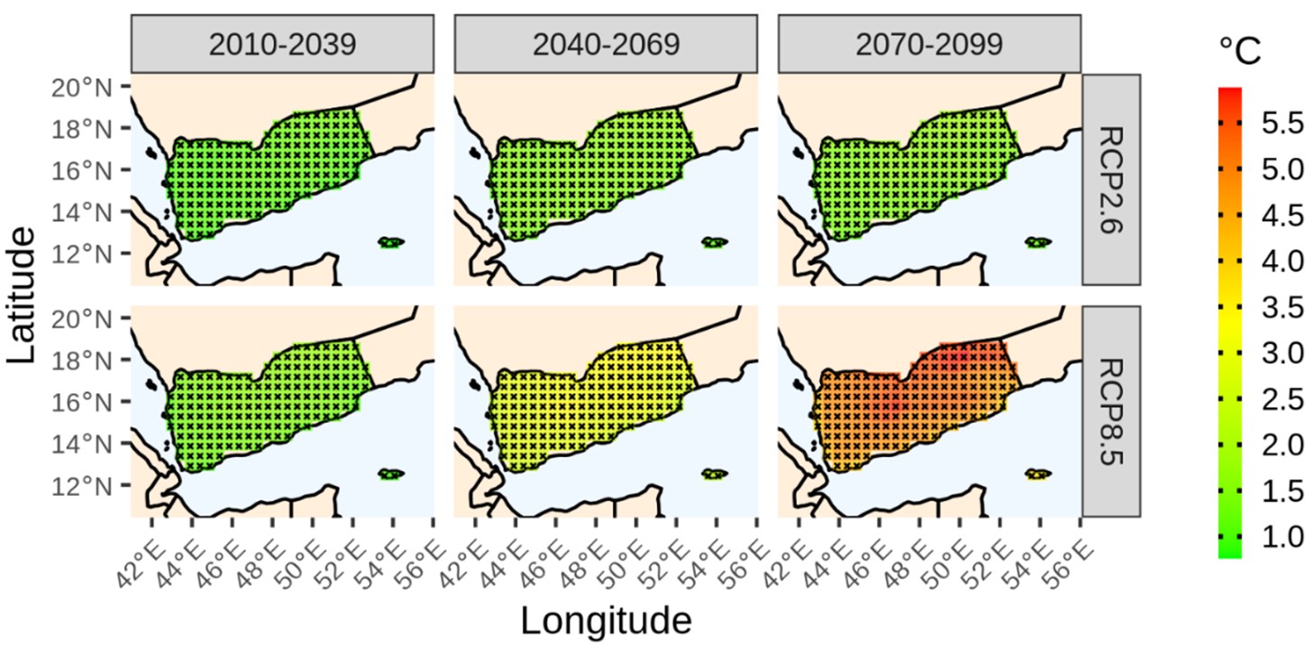 وتظهر خرائط هذا السيناريو المتوقع زيادة بدرجات الحرارة في اليمن بمقدار 2 إلى 3 درجات مئوية خلال العشرة الأعوام القادمة.