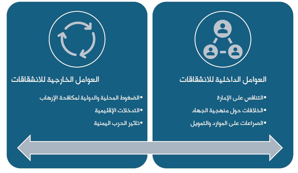 يمكن القول إنّ فرع تنظيم القاعدة اليمني نجح إلى حد ما في احتواء الانشقاقات التي شهدها خلال السنوات الماضية، إلا أنه لم ينجُ من آثارها، وخصوصا الانشقاق على إثر الخلاف مع تنظيم الدولة الإسلامية. ما زاد الطين بله، هو أن الانشقاقات الأخيرة تزامنت مع عمليات غير مسبوقة للقوات الجنوبية ضد التنظيم.
