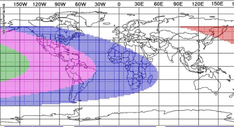 - رؤية الهلال ممكنة فقط باستخدام التلسكوب من المناطق الواقعة في اللون الأزرق.