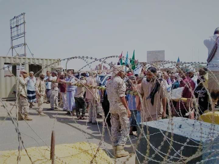 - الصورة: محتجين عسكريين أمام بوابة مقر التحالف العربي بمديرية البريقة بعدن، بعد أن أغلقوا طريقا يؤدي للمقر، الأحد، 30 أغسطس (نشطاء)