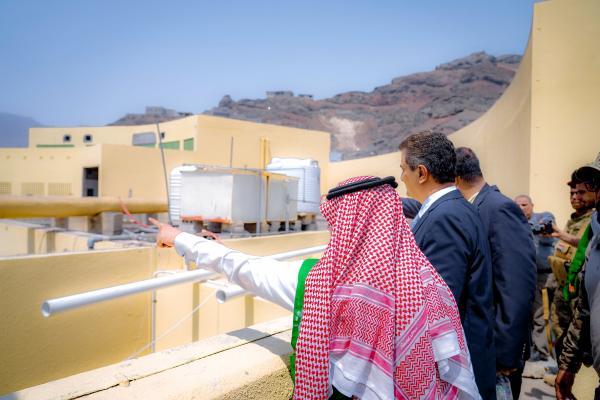 محافظ عدن أحمد حامد لملس بجوار مدير البرنامج السعودي لتنمية وإعمار اليمن المهندس أحمد مدخلي، وهم يضعان حجر أساس أحد مشاريع الطرق بعدن، 15 سبتمبر 2020 (المكتب الإعلامي للمحافظ)