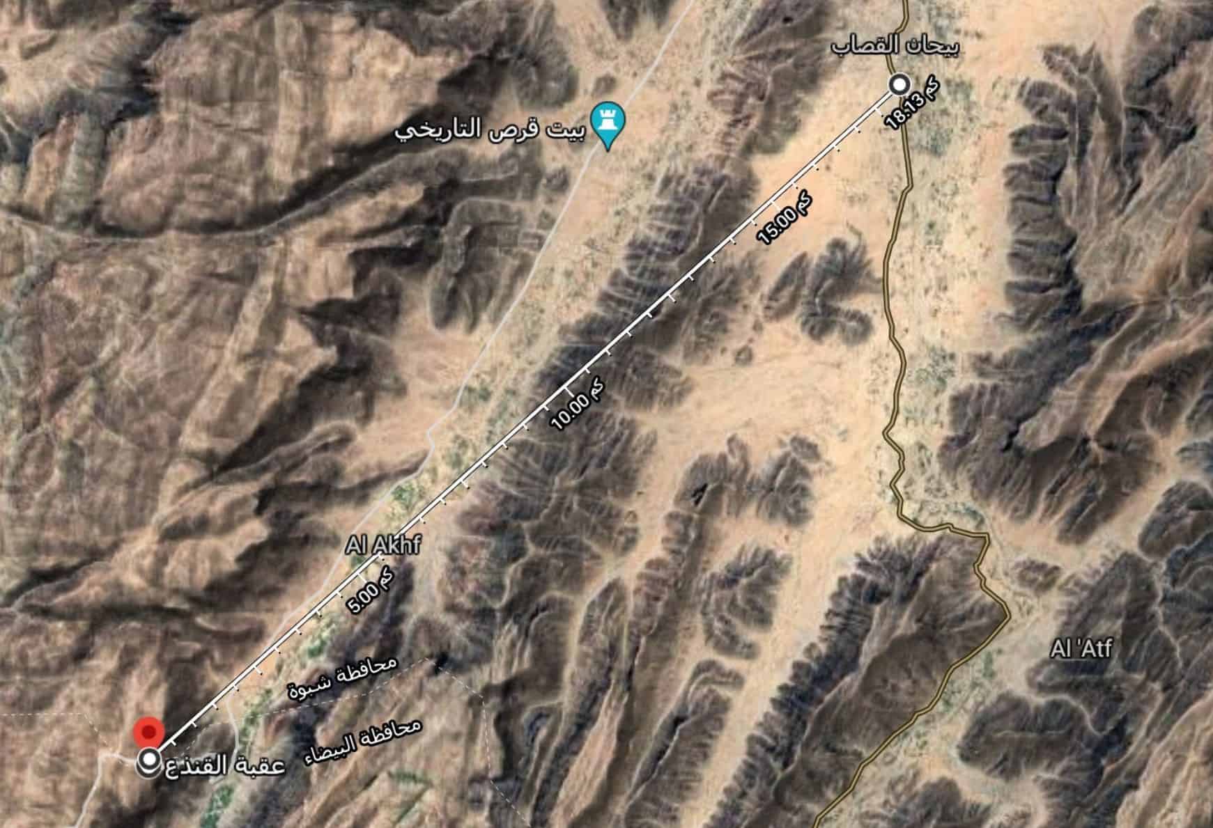 - Photo: A map from Google showing the distance from "Aqabat Al-Qunthaa" in Al-Bayda, which was controlled by the Houthis, to the city of Baihan in Shabwa Governorate, South Yemen (South24)