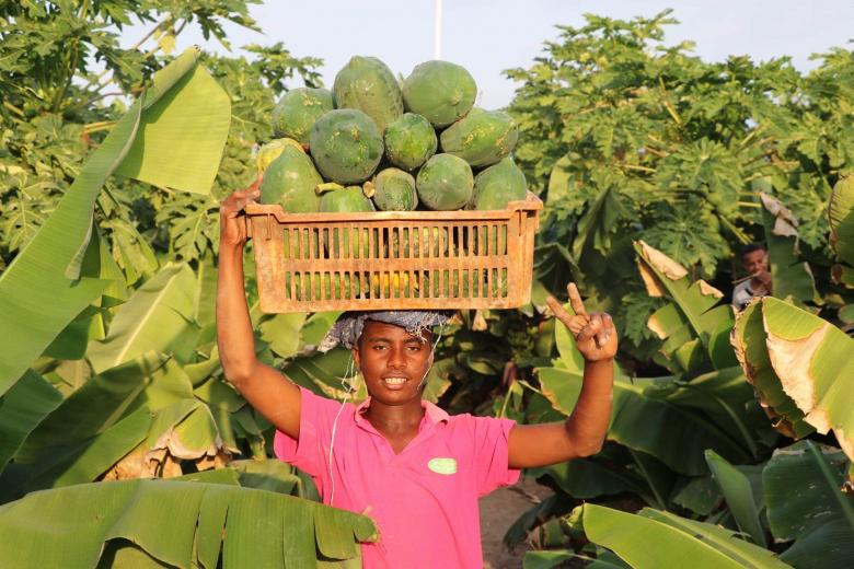 Photo: A young farmer holds a papaya in the Al-Koud area, Abyan governorate (South24, Abdelilah Omairan)