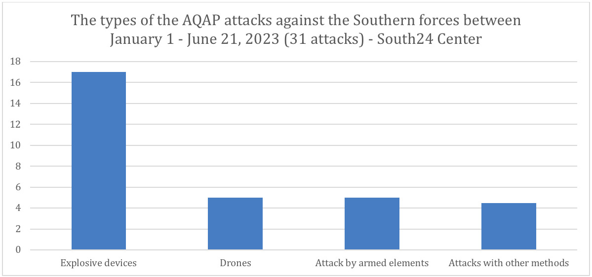 From the beginning of 2023 till today, AQAP attacks against the Southern forces are about 31 separate operations in Abyan and Shabwa. The group claimed responsibility for carrying out these attacks in official statements on its media platform "Al-Malahim".