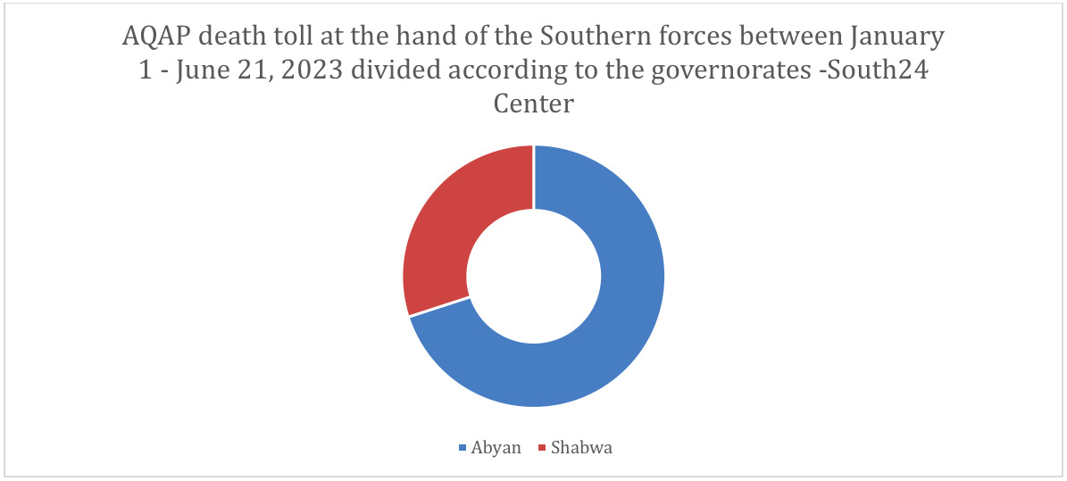 The victims within the Southern forces as a result of the AQAP attacks between January 1 - June 12, 2023, divided according to the governorates, - South24 Center | ||