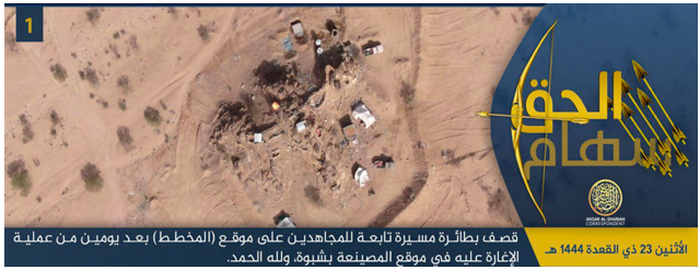 An aerial photo published by AQAP which said that it was taken during a drone bombing of a site affiliated with the Shabwa Defense Forces in Al-Masaniah, June 14, 2023.