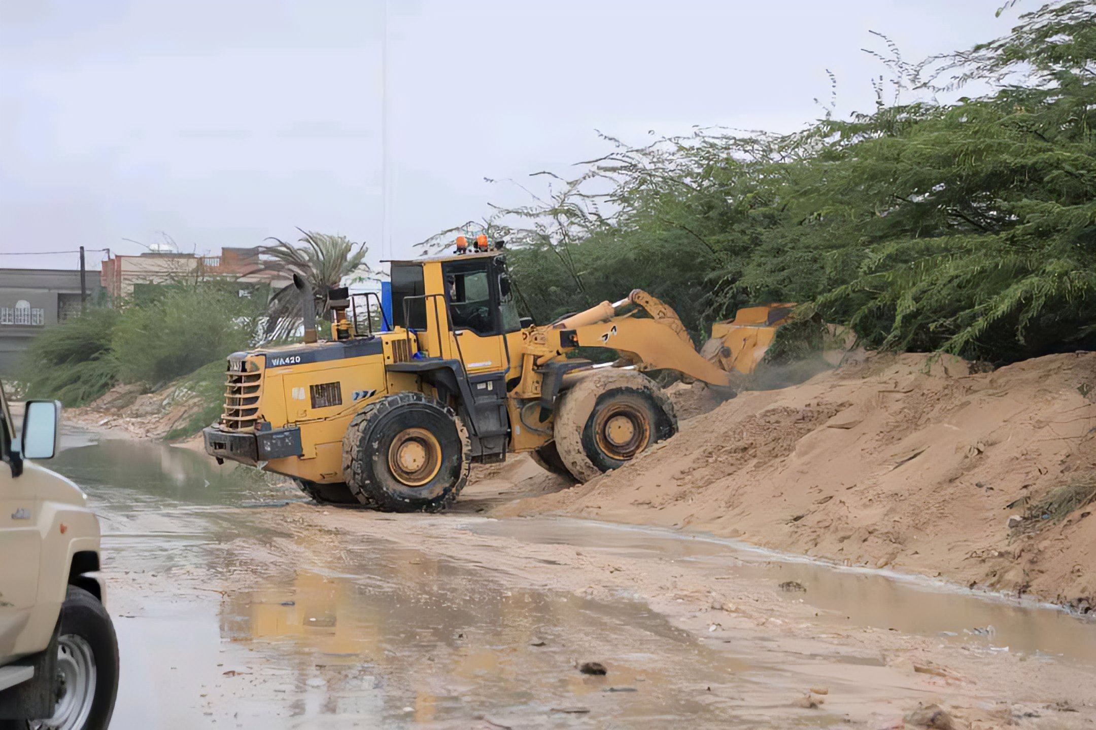 Bulldozers remove mud from a road in the city of Al-Ghaydah in Al-Mahra, October 23, 2023 (Governorate Media Center).
