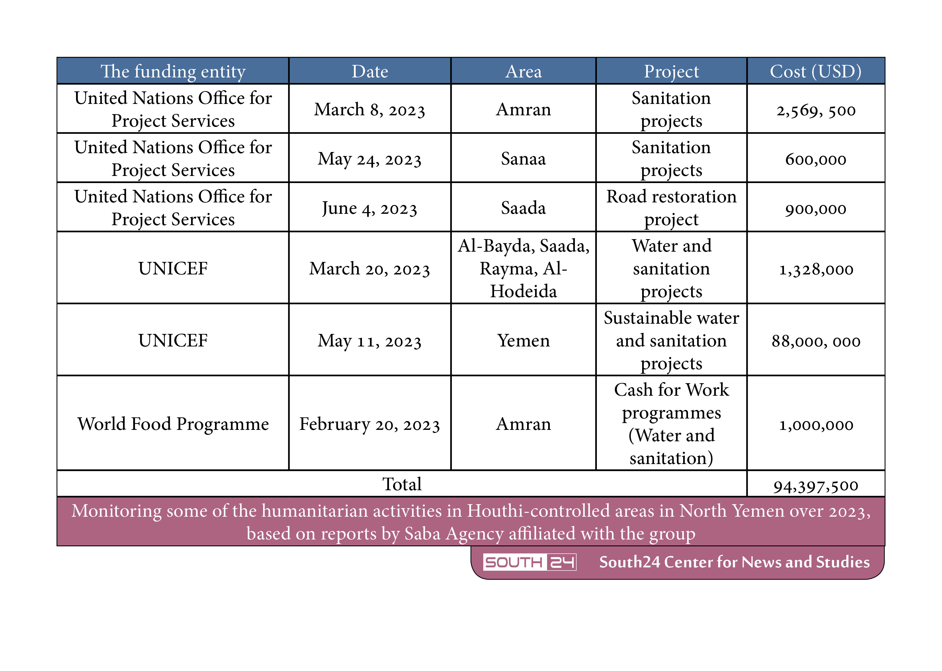 Over the first half of the last year, ‘South24 Center‘ listed projects worth $94 million in the Houthi-controlled areas, funded by three UN bodies, including United Nations Office for Project Services, UNICEF, and the World Food Programme.