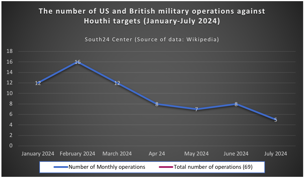 2-The Ineffectiveness of the ‘qualitative operations’ against the Houthis: Although the American-British attacks on the Houthi militia, reached about 70 [27] till August 3, and despite their operational intensity, they haven’t impacted the capabilities of the militia in a way that could push them to stop escalation in the Red Sea. This can be justified in light of some main considerations, the first of which is the assumption that the Houthis always have prior knowledge of American attacks. This is related to several Western reports about imminent attacks against the group which are probably followed by the Houthis, moving them to change their weapon storage locations. The second consideration is that the Houthis, like most militias in the region, mainly depend on primitive and portable missile launchers whose locations can be easily changed. The third is that the majority of the group’s first-rung leaders hide inside underground bunkers. Therefore, targeting them directly is a difficult task.