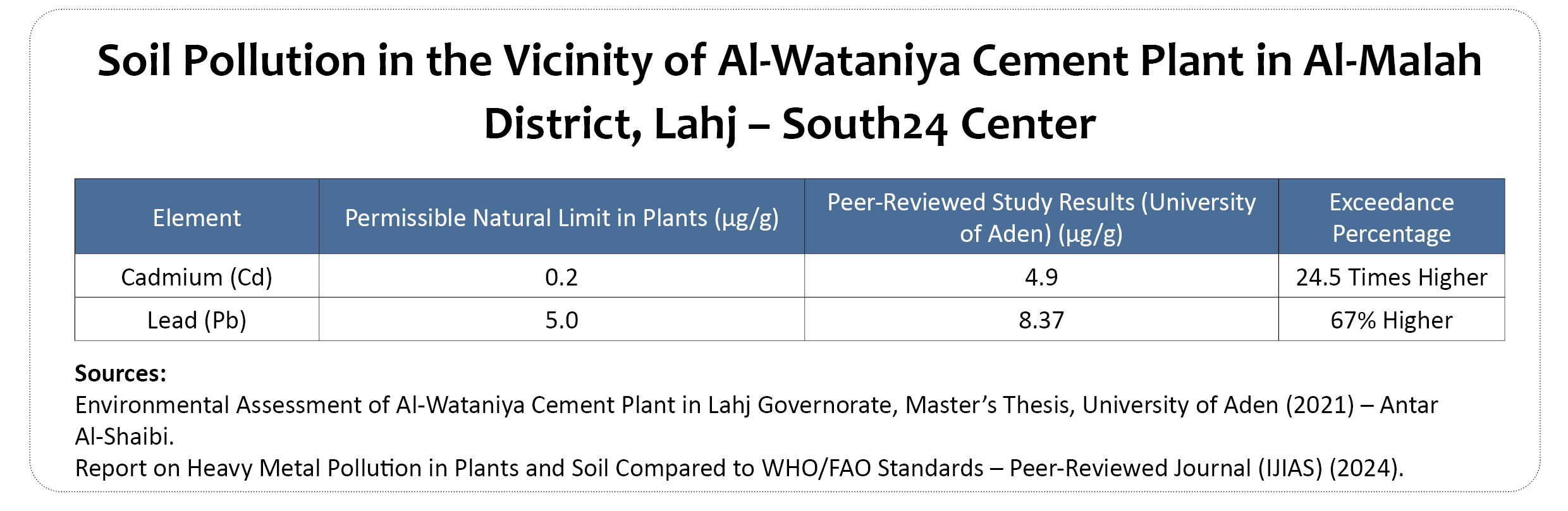 Soil testing conducted as part of the same study included 11 samples—three from within the plant perimeter and eight from its surroundings at distances of 500 and 1,000 meters in four directions. The results revealed moderate contamination levels for lead, copper, and nickel, while cadmium and zinc levels indicated “severe enrichment”, reaching thresholds categorized by the US Environmental Protection Agency as extreme [4].