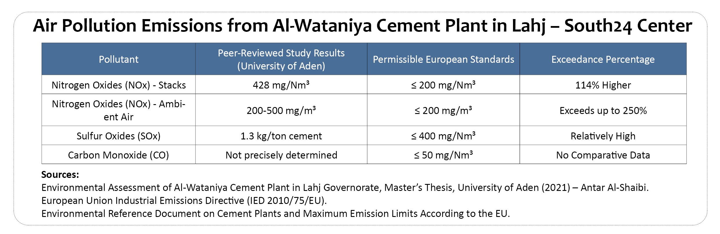 Research led by University of Aden environmental specialist Antar Al-Sha’ibi confirms that combustion byproducts from the plant’s furnaces—particularly carbon dioxide (CO₂), sulfur dioxide (SO₂), nitrogen oxides (NOx), and carbon monoxide (CO)—are released in significant volumes [3]. Atmospheric CO₂ concentrations in the factory’s vicinity were found to exceed natural baseline levels, a direct result of the plant’s dependency on coal combustion.
