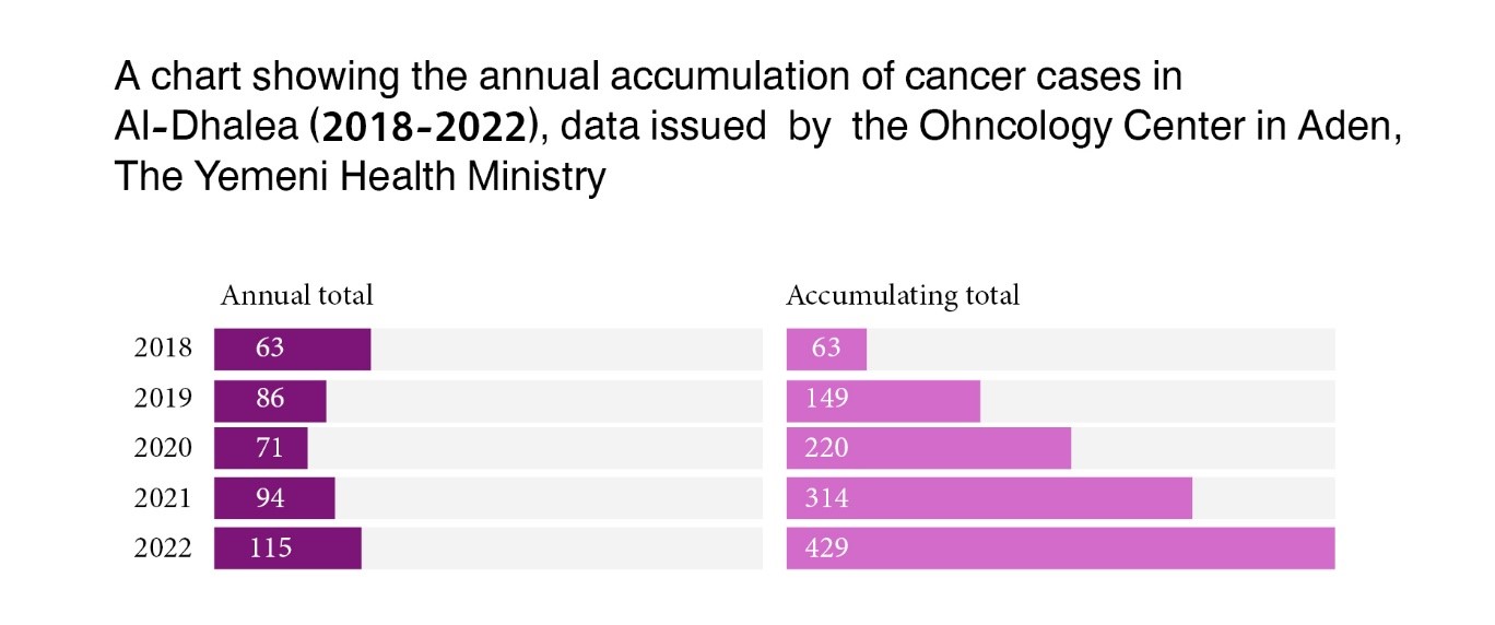 However, according to official statistics issued by the Health Ministry and obtained by ’South24 Center‘, the Oncology Center in Aden documented 429 cancer cases from Al-Dhalea between 2018-2022. Official data shows a marked rise in the number of cancer cases over five years. The total cases climbed from 63 in 2018 to 114 in 2021 and 2022, pointing to nearly doubling of cases during the period.