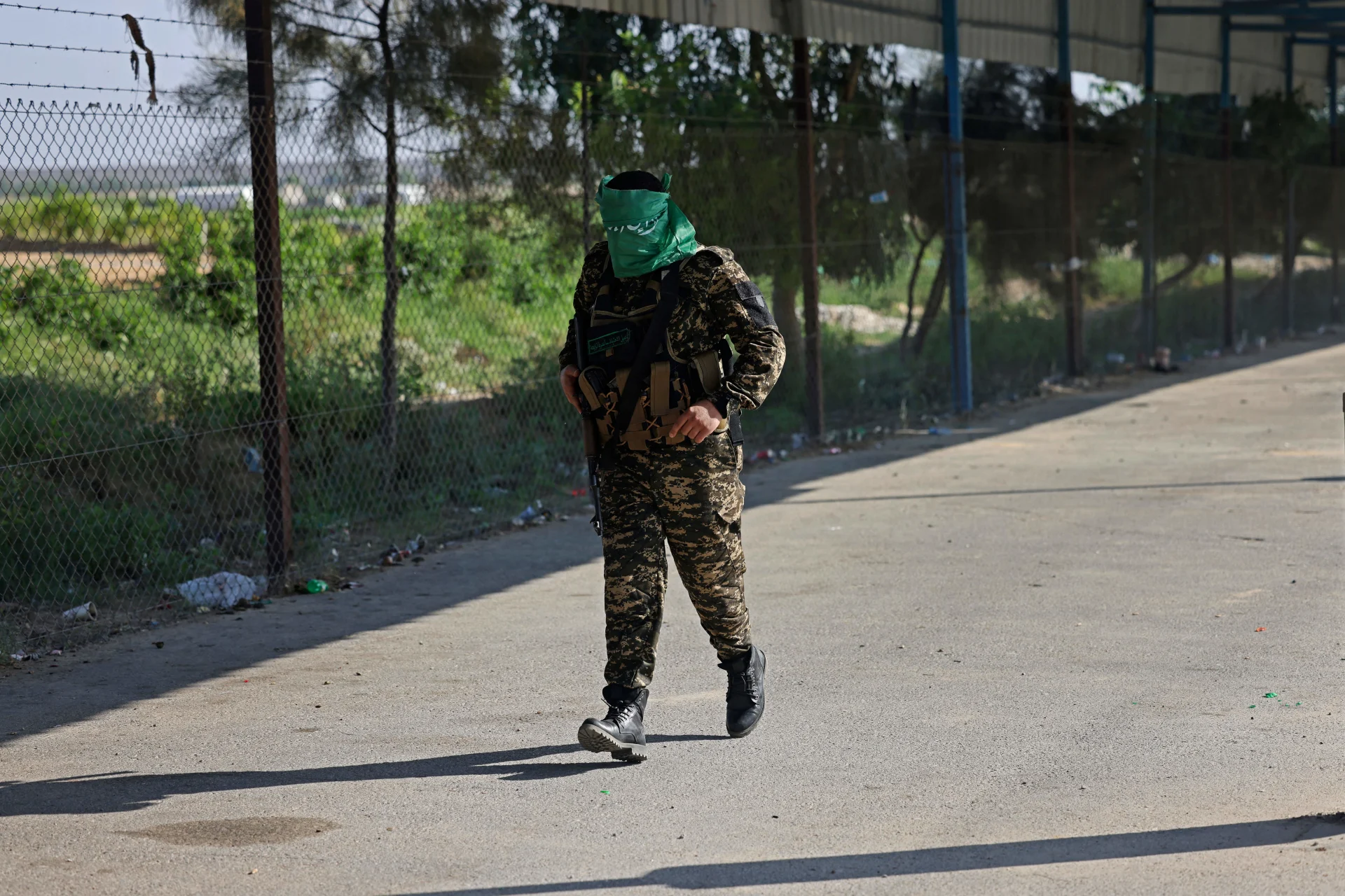 أحد المسلحين الفلسطينيين يركض باتجاه معبر إيرز بين إسرائيل وشمال قطاع غزة في 7 أكتوبر 2023 (Credit: MOHAMMED ABED/AFP via Getty Images)